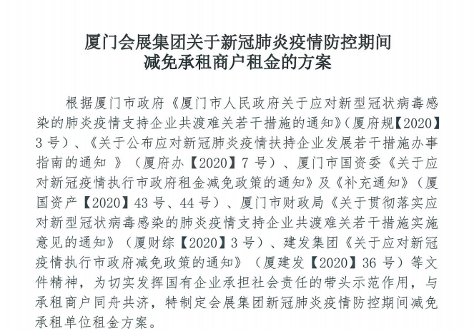 厦门会展中心公司对承租会展中心A馆、B馆及厦门沧江会展中心展馆配套出租经营场地施行“2月租金全免,3、4月租金减半”的基础上,对符合在厦门区域范围内注册成立并进行纳税申报的正常经营的中小微企业和个体工商户延续减免5、6月的一半租金,进一步帮助中小企业恢复经营生产。