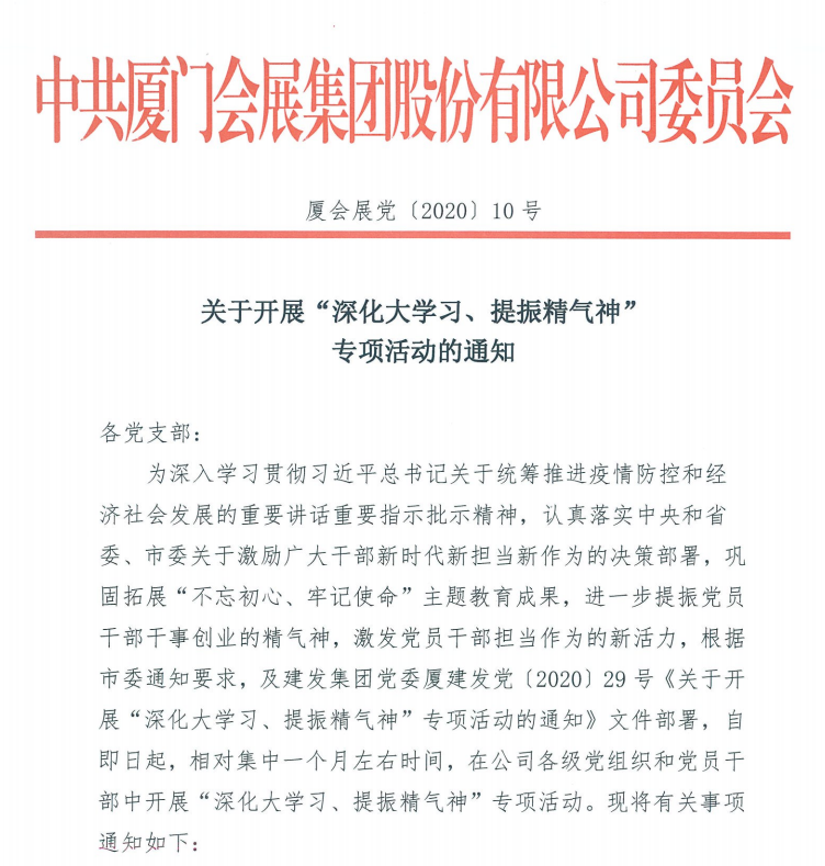 根据中央和省委、市委的决策部署,以及建发集团党委文件要求,会展集团党委从2020年5月初起,在公司各级党组织和党员干部中开展“深化大学习、提振精气神”专项活动。